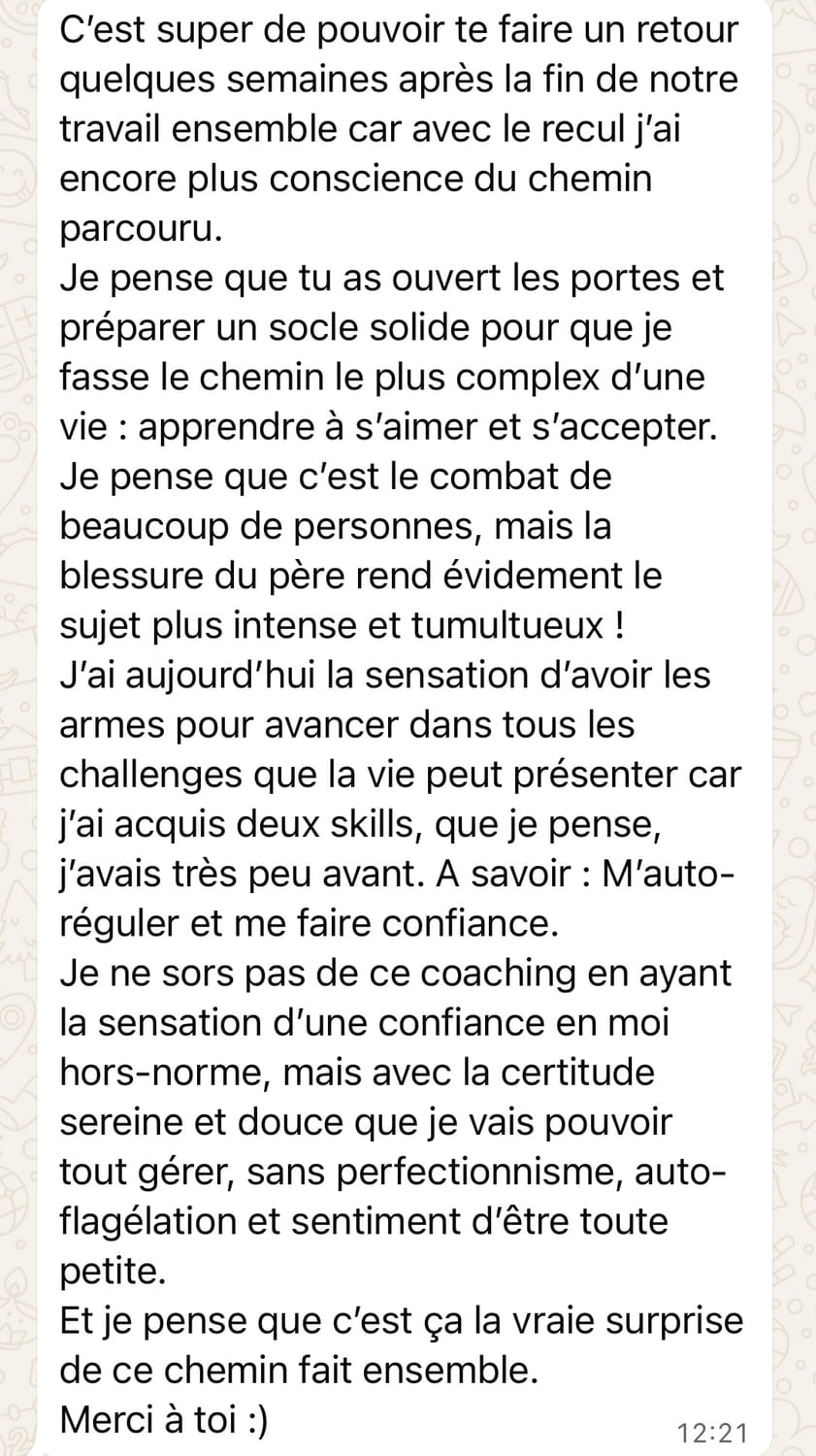 " C’est super de pouvoir te faire un retour quelques semaines après la fin de notre travail ensemble car avec le recul j’ai encore plus conscience du chemin parcouru.